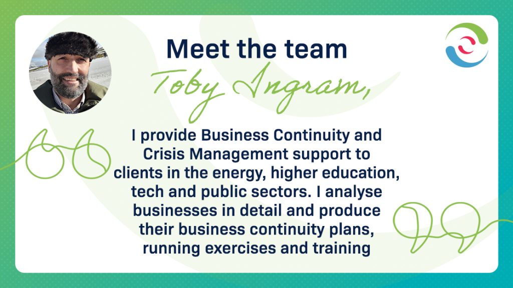 - As a Senior Consultant, I provide business continuity and crisis management support to clients in the energy, higher education, tech and public sectors. I analyse businesses in detail and produce their business continuity plans, running exercises and training. I ensure they are “ready for audit tomorrow” and then indulge in the most interesting part of the job, which is horizon-scanning, and preparing client businesses for the event-after-next.
